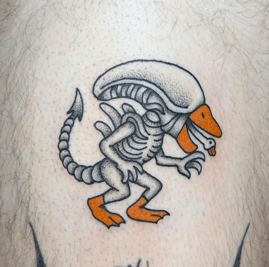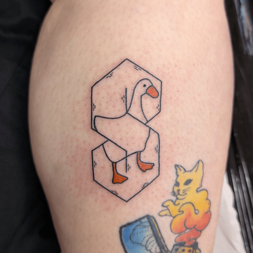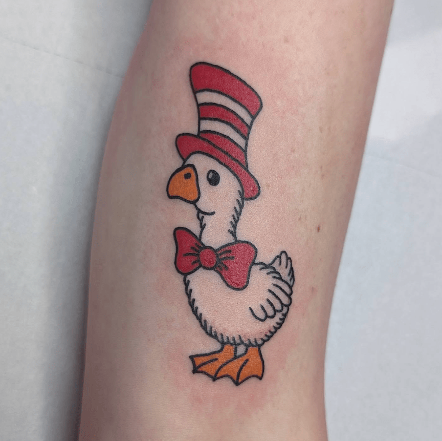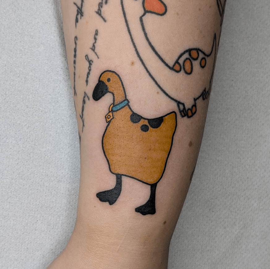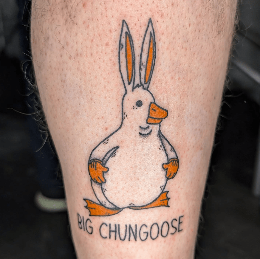 Pop culture references are a common theme in Silas’ work. There’s moments and quotes from classic movies with the protagonist reimagined as a goose, tv characters or musicians styled as geese, or internet memes, substituting in geese. The puns relating to geese (bread/goose/gander/honk) and Silas’ own captions add a further layer of humour to these already silly goose tattoos.