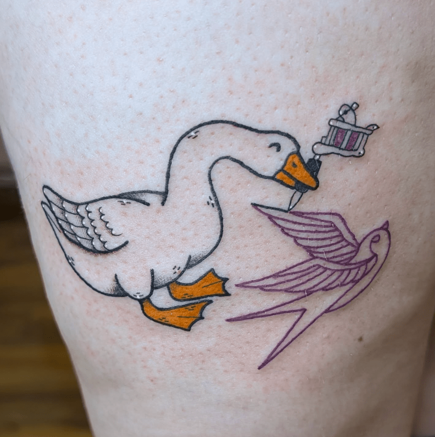 If you don’t take life or tattoos too serious, a silly goose tattoo will perfectly reflect your playful personality. You have the choice to develop your own concept or mashup, or take your pick from Silas’ available pre-drawn flash designs.