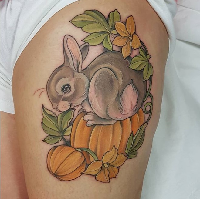While I have selected some of Bray’s fall themed inspired pieces to show you just how stunning her tattoos are, her work is, of course, not solely autumnal themed. Her Instagram feeds is filled with animals from land, air and sea, either placed in nature or wearing adorable little outfits.