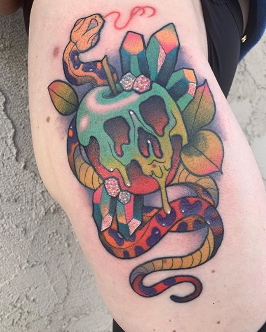 Snake, crystals and poison apple tattoo by @carly.tattoos