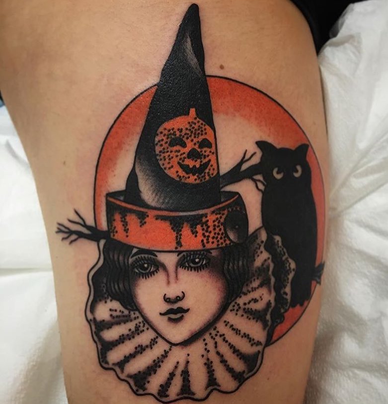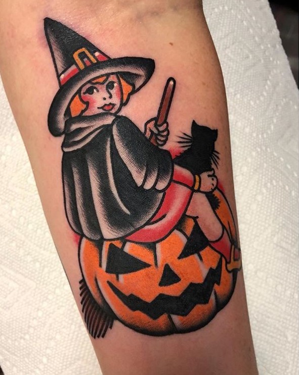 Traditional witch and jack-o’-lantern tattoo by @monikadarling