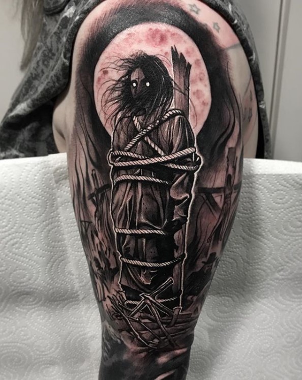 Dark trash realism witch trial tattoo by @anrijsstraume