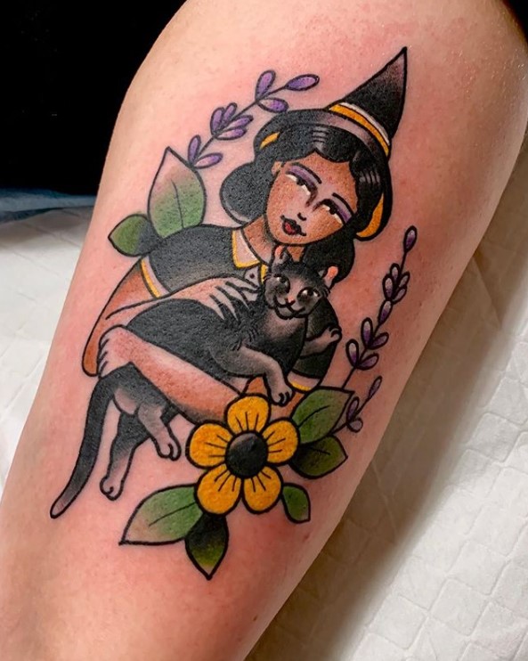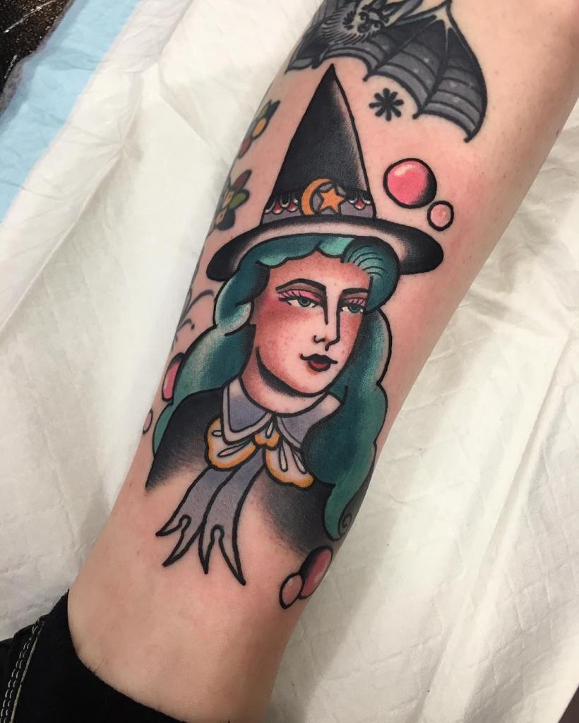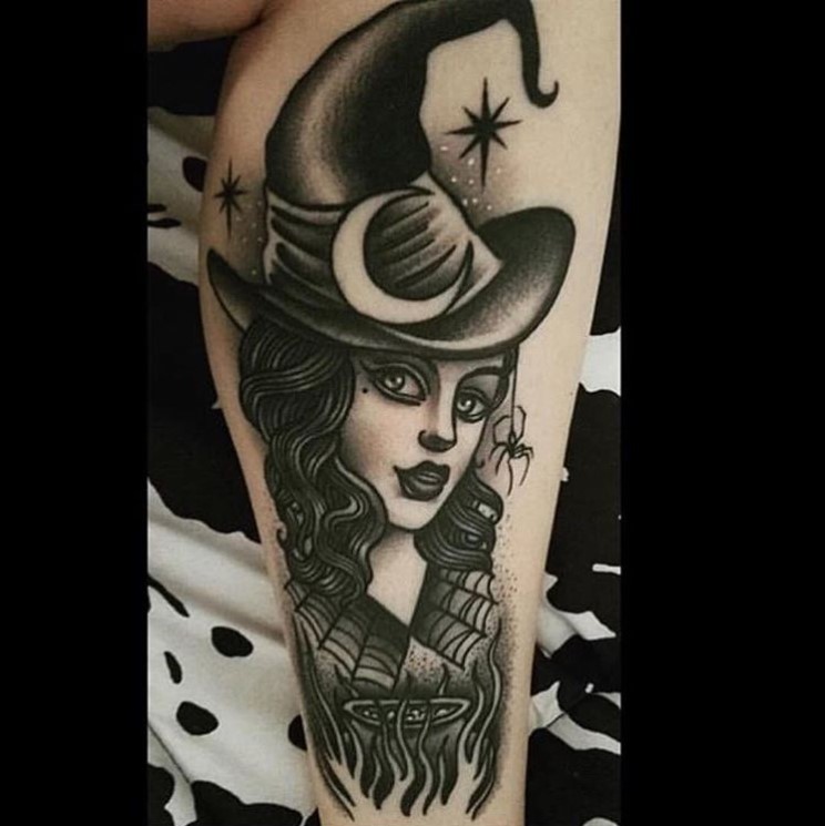 Traditional style decorative witch tattoo by @sammyvanhiggins