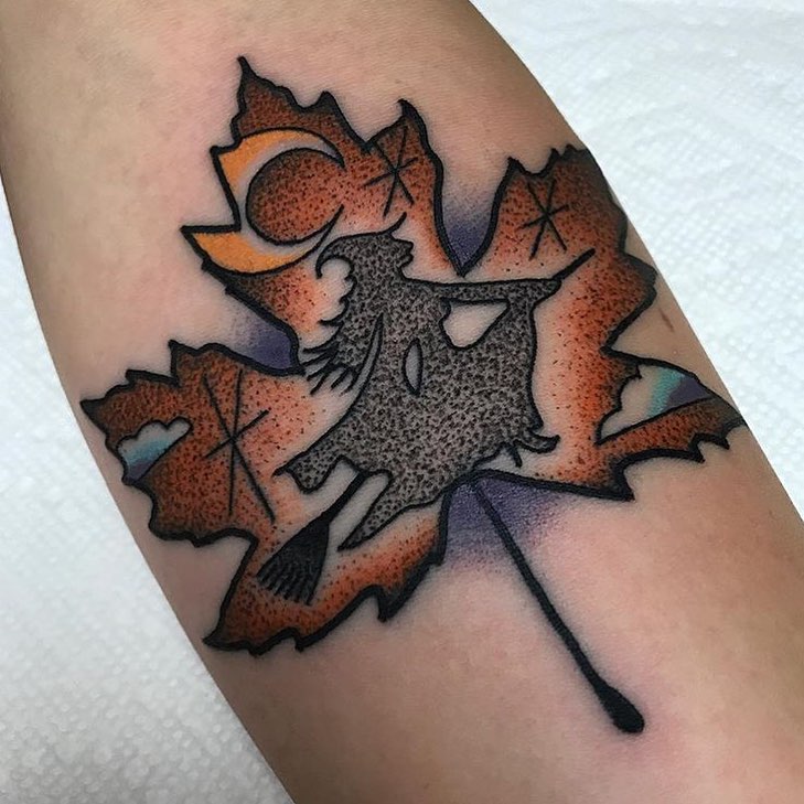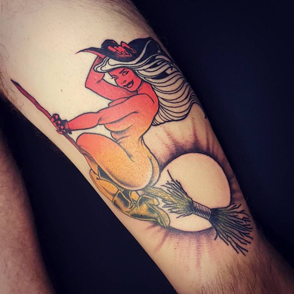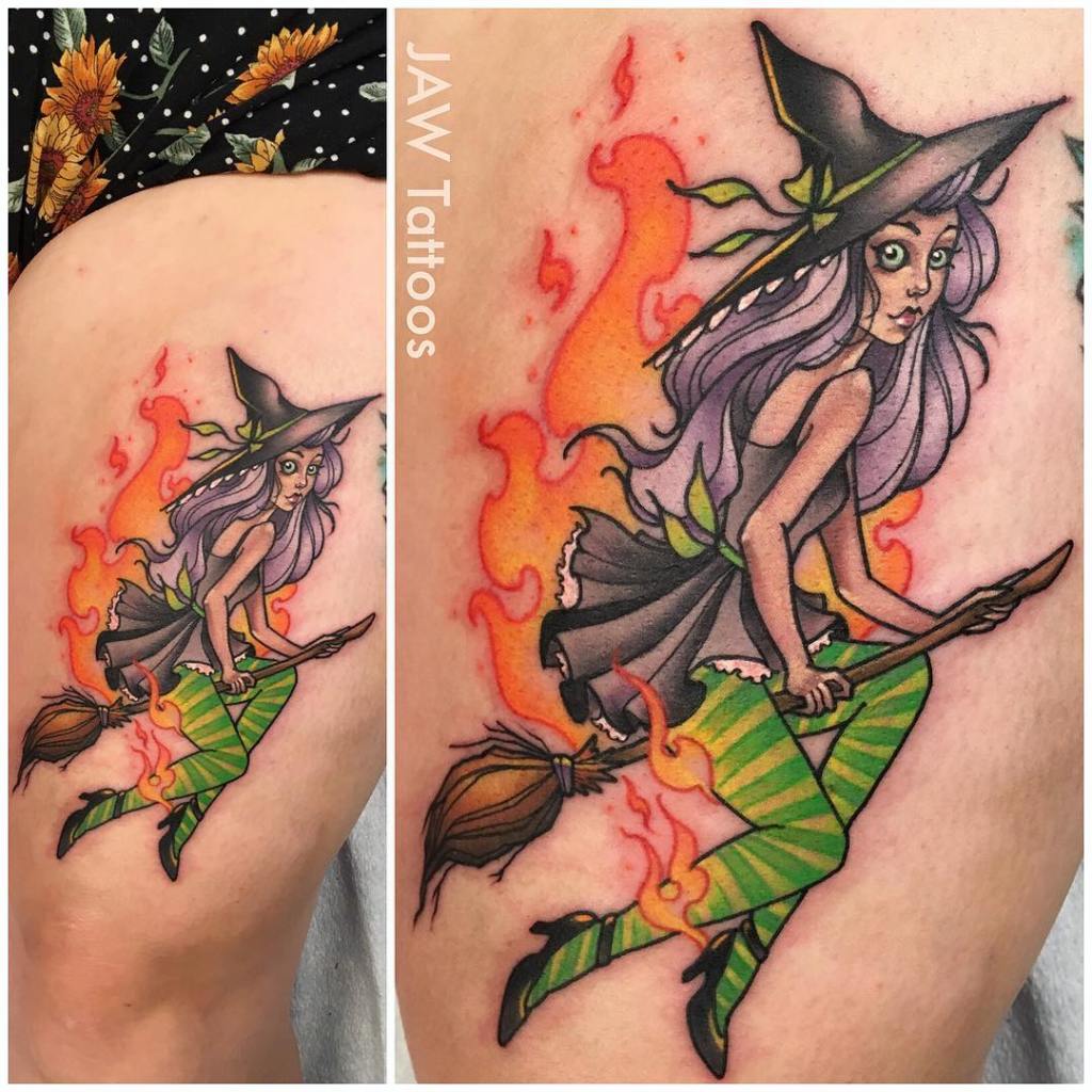 Witch riding her broomstick tattoo by @jawtattoos