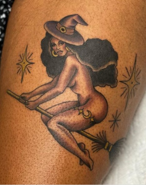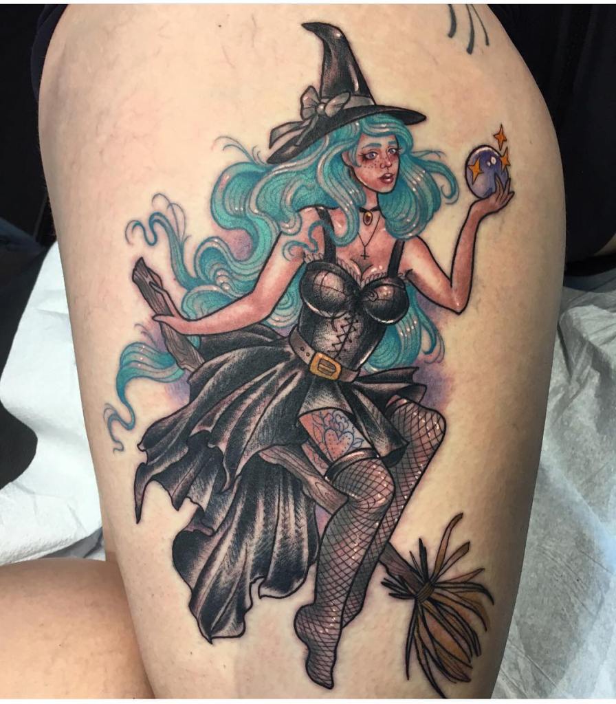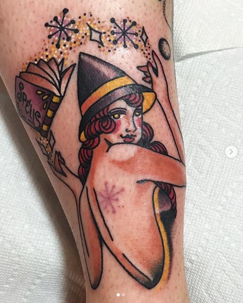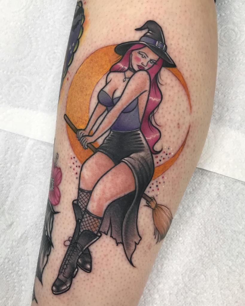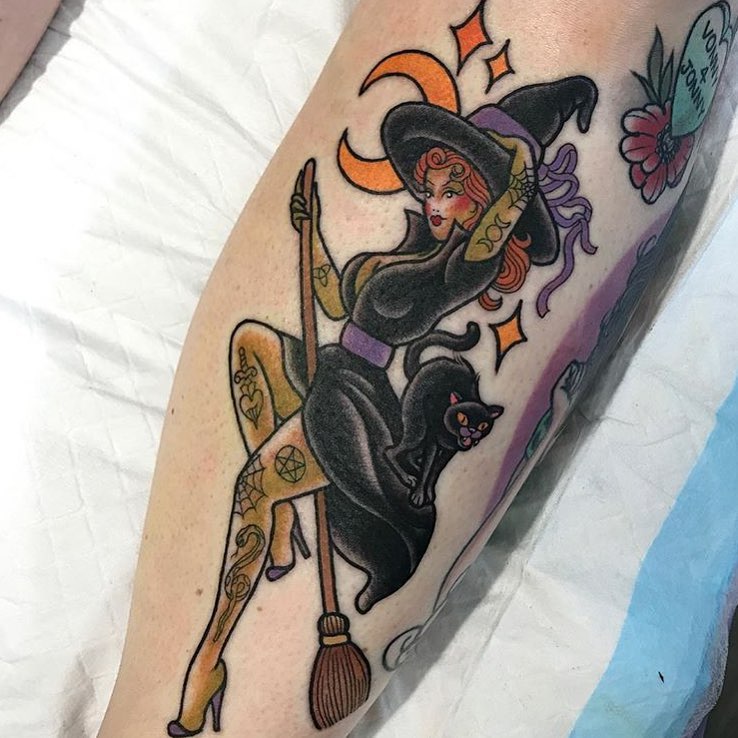 Neo trad witch pinup tattoo by @stephanie_melbourne