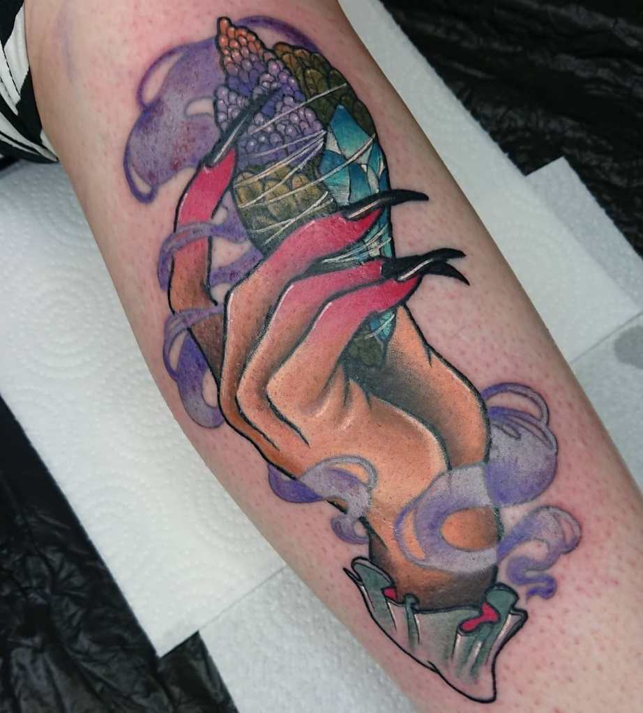 Neo trad witch hand holding sage and crystals tattoo by @bethrosetattoo