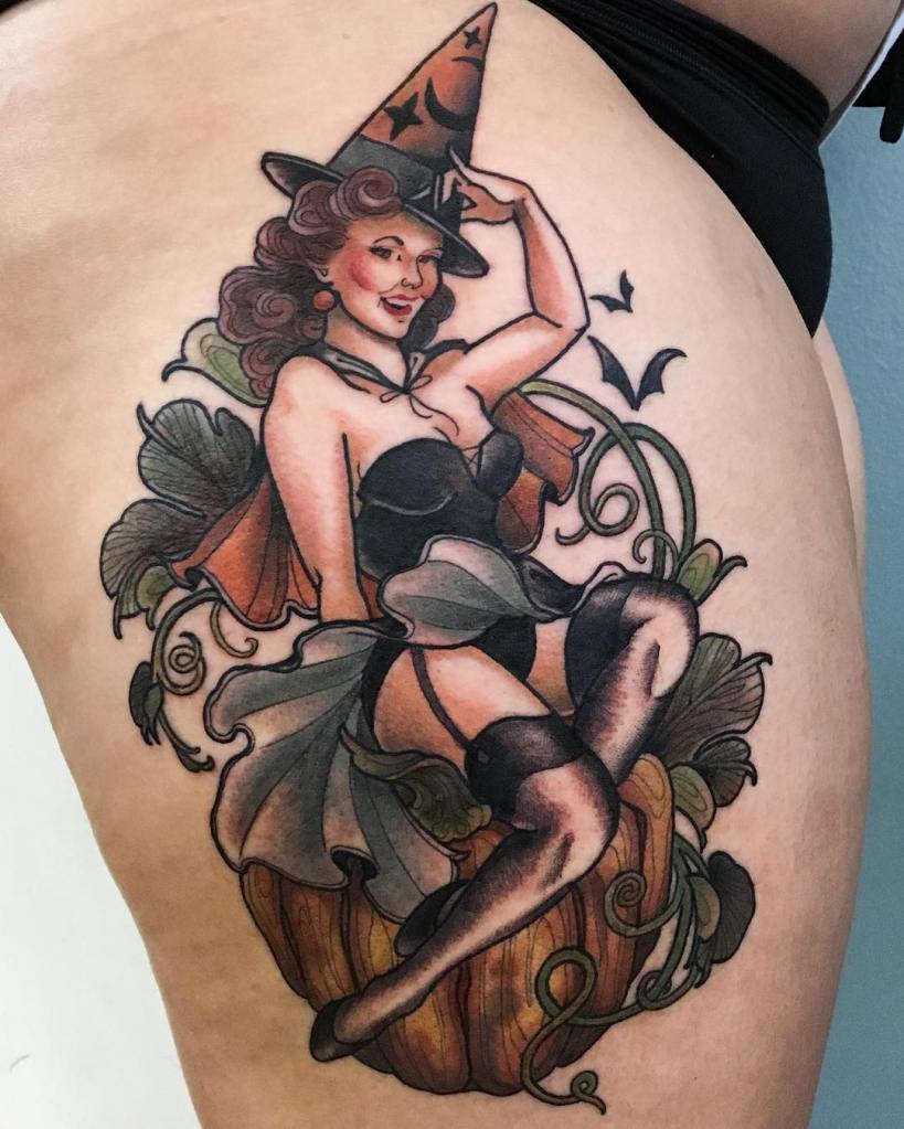Stylised witch pinup and pumpkin tattoo by @alexisethomson