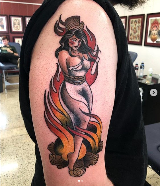 Traditional style witch burning at the stake tattoo by @chuligonzaleztattooer