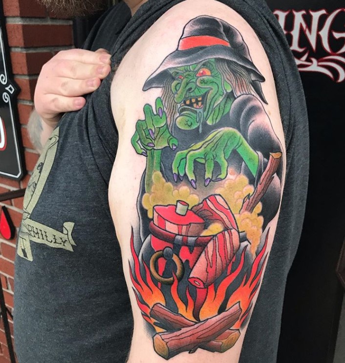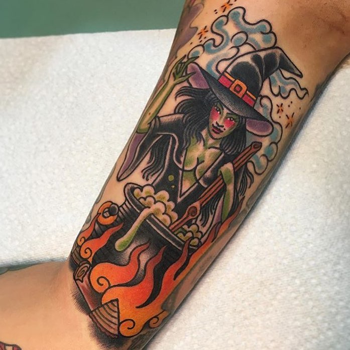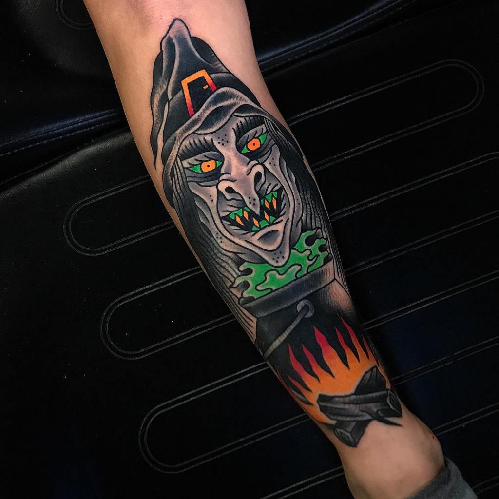 Traditional style evil witch and cauldron tattoo by @dan_gagne