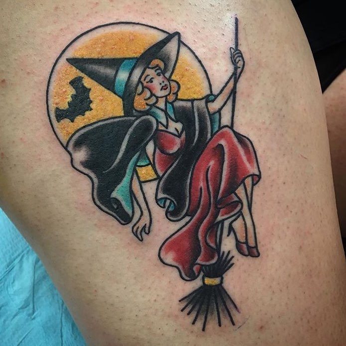 Traditional style witch on a broomstick tattoo by @aaronfrancione