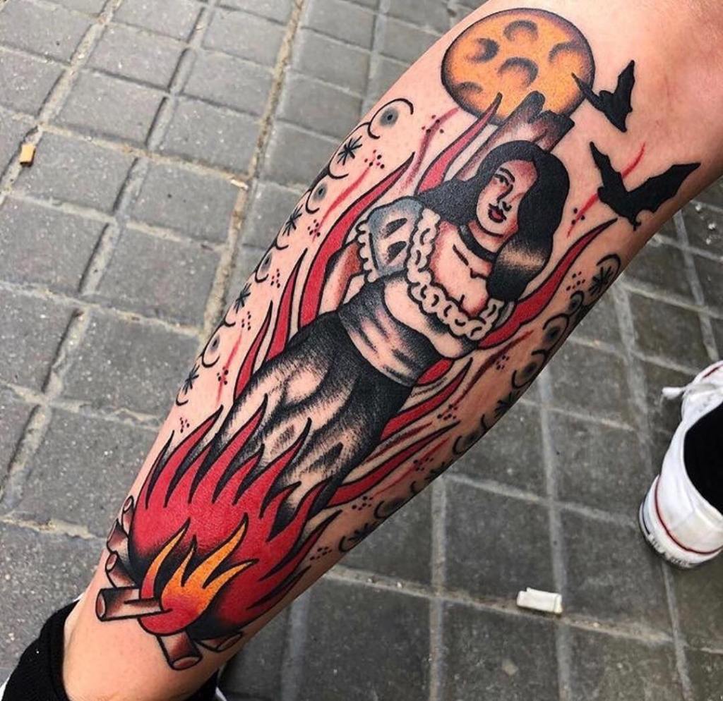 Traditional burning witch tattoo by @_kimtattoo_