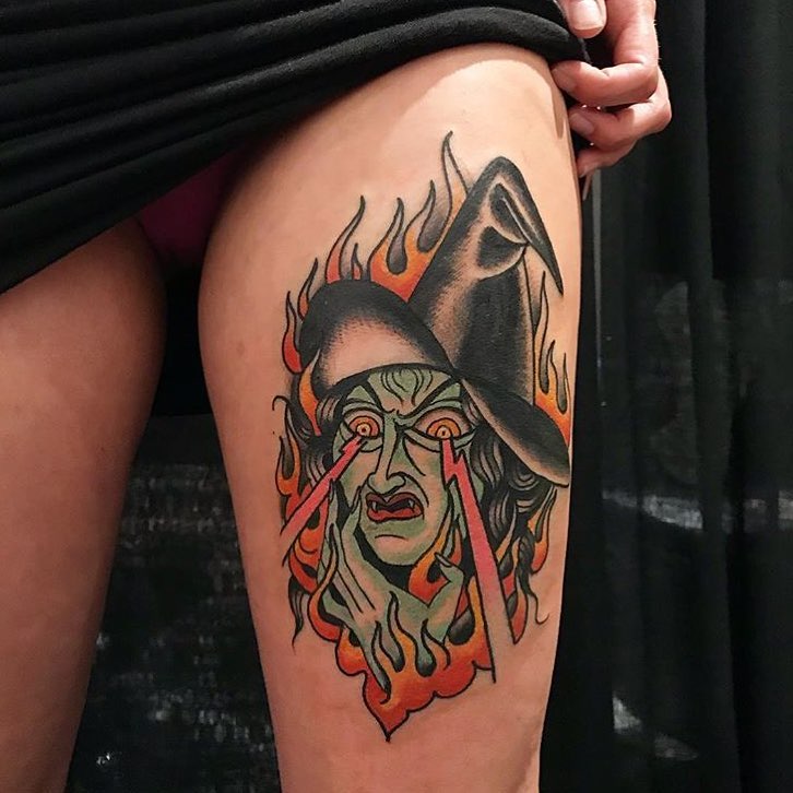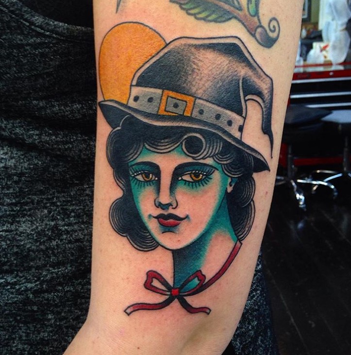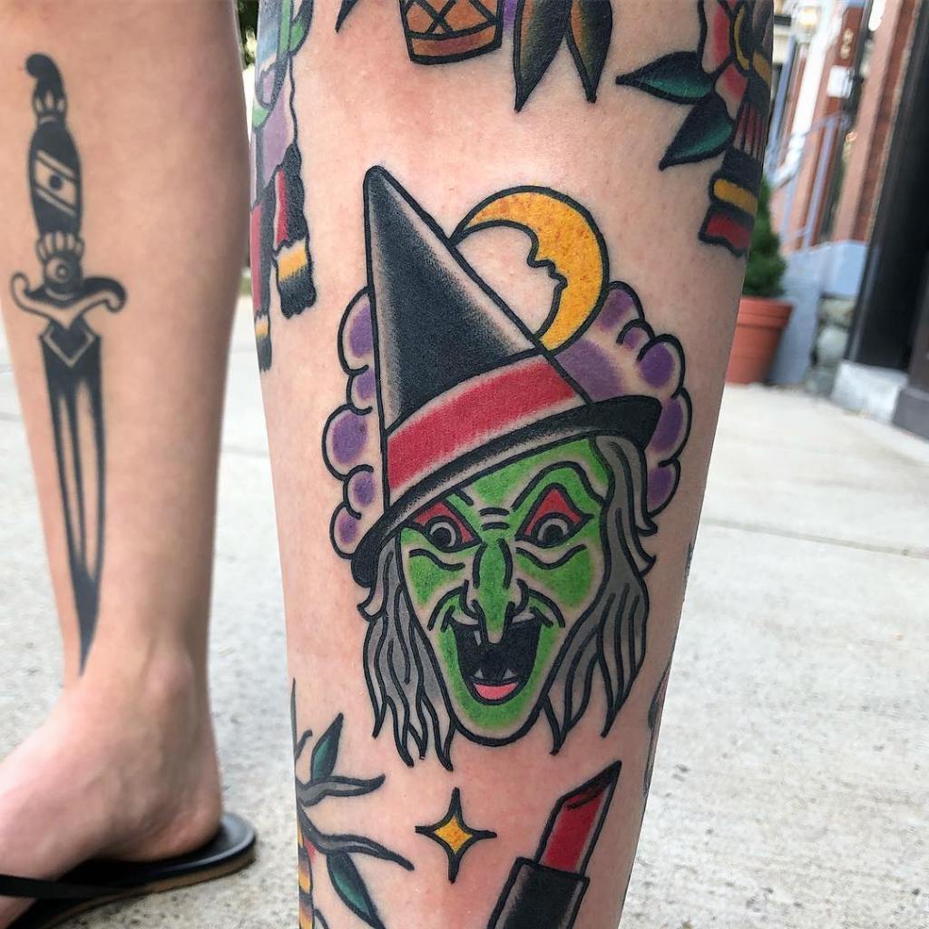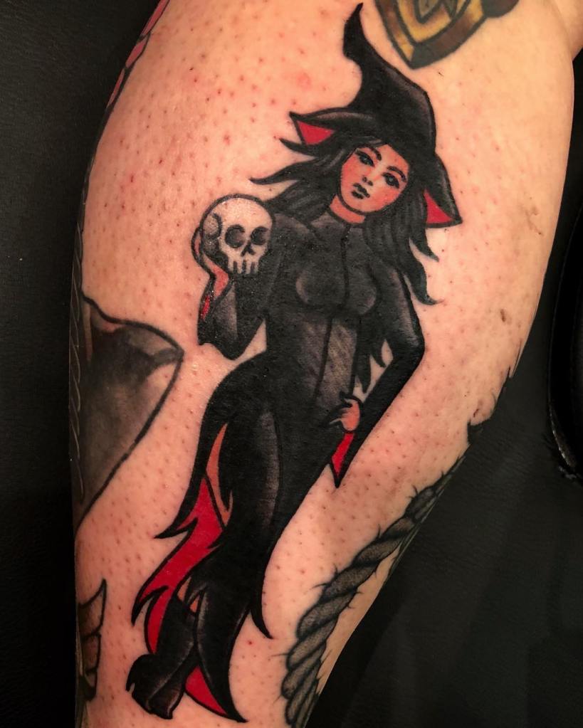Traditional style evil witch tattoo by @heathnocktattoo