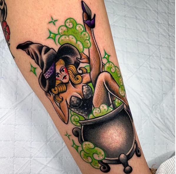 Traditional witch and cauldron tattoo by @the_samazonian